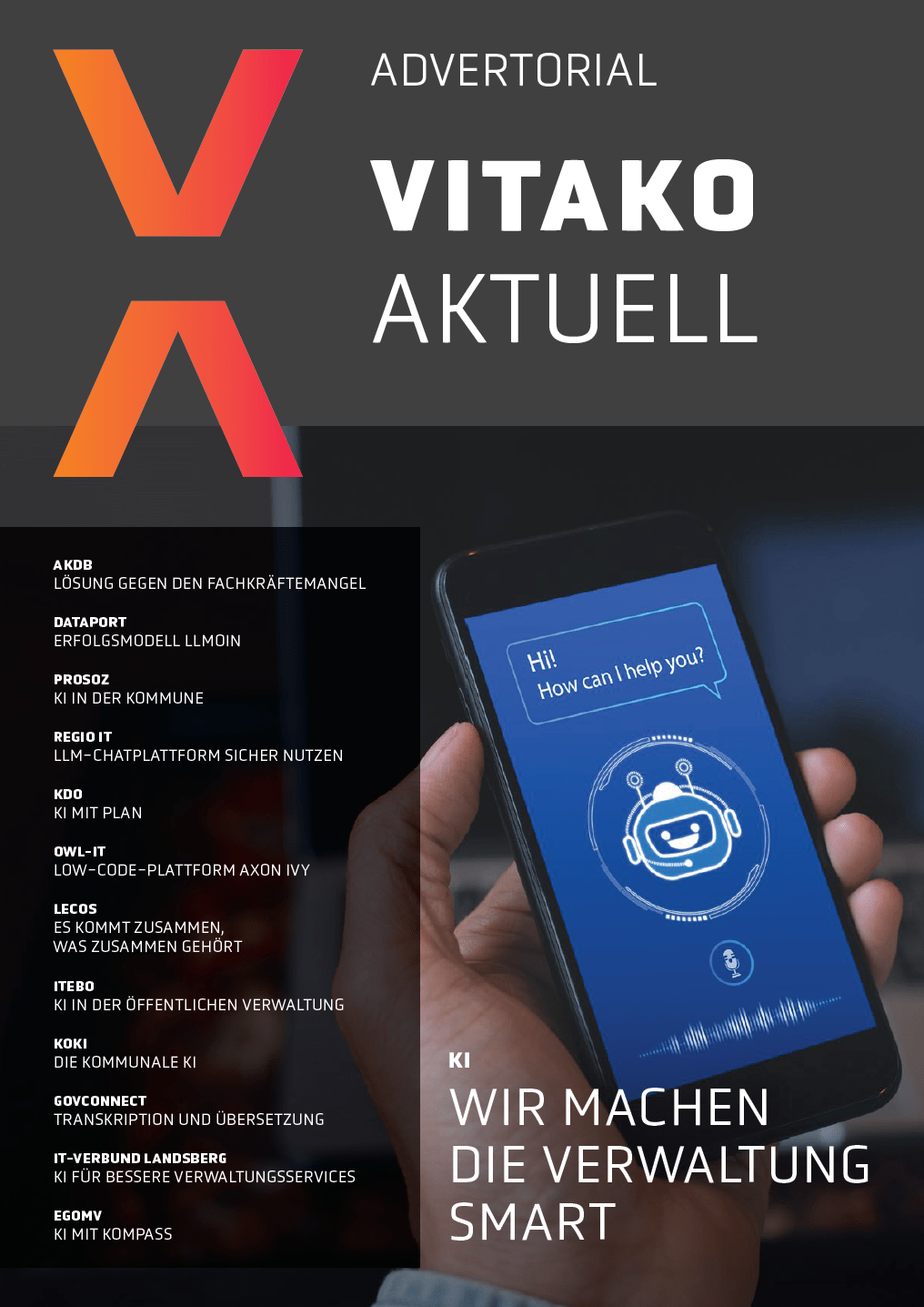 Kommunale IT-Dienstleister zeigen, wie KI die Verwaltung smarter macht In der aktuellen Ausgabe von Vitako aktuell 03/2025 setzt ein umfangreicher Advertorial-Beileger ein starkes Zeichen: Die kommunalen IT-Dienstleister in Deutschland präsentieren konkrete Lösungen und Innovationen rund um Künstliche Intelligenz, Low-Code und Digitalisierung – praxisnah, zukunftsweisend und vor allem: kommunal gedacht. Unter dem Titel „Wir machen die Verwaltung smart“ zeigen unsere