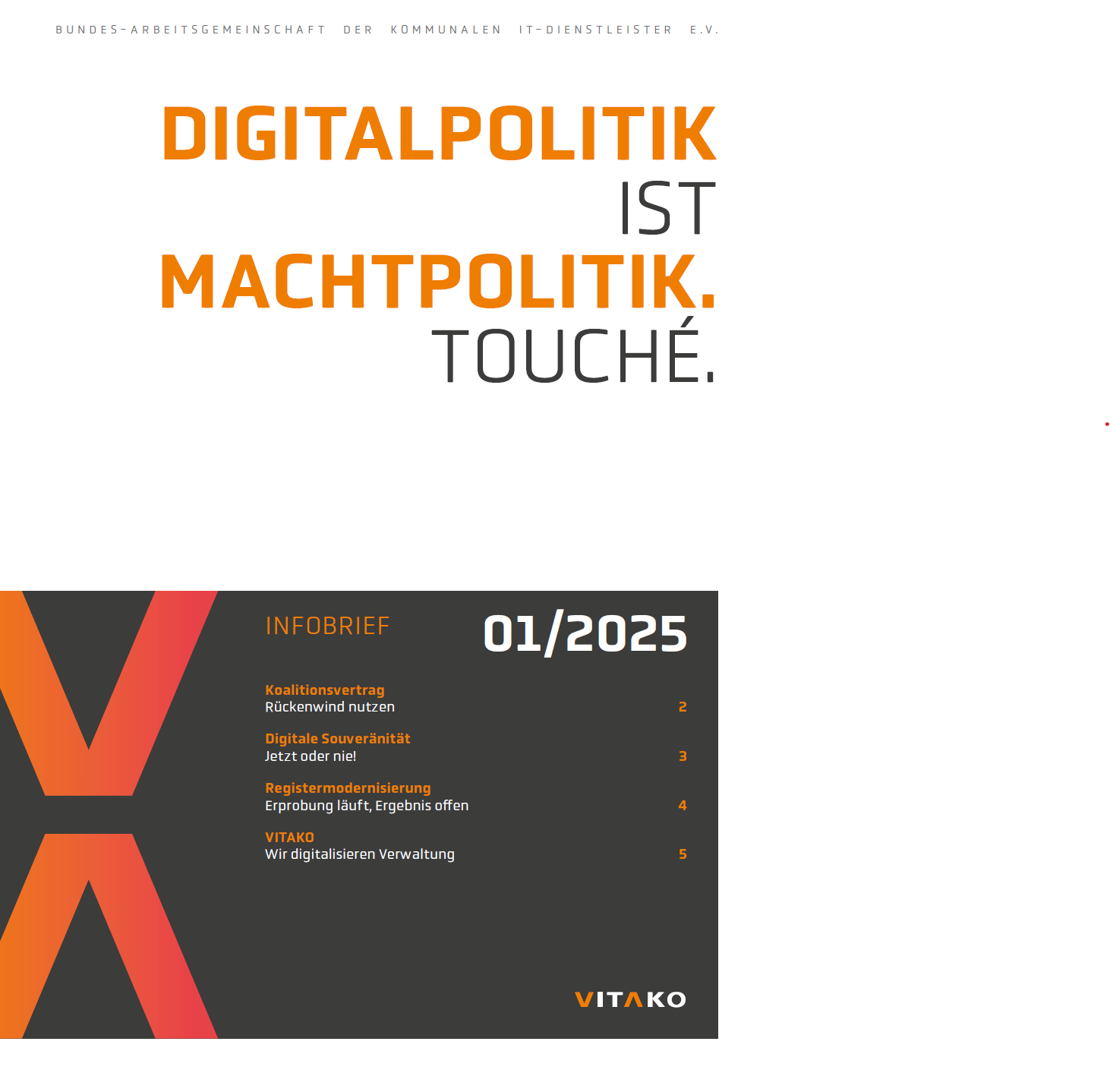 • Mit dem neuen Infobrief 01/2025 stellt VITAKO klar: Digitalpolitik genießt in der neuen Bundesregierung endlich Priorität. Abzulesen insbesondere an dem neuen Ministerium für Digitales und Staatsmodernisierung – ein längst überfälliger Schritt. Nun gilt es, wichtige Themen aus dem Koalitionsvertrag anzugehen und konsequent umzusetzen. Die Verwaltungsdigitalisierung braucht jetzt entschlossene Umsetzung. Rückenwind gibt es – etwa durch das neue Digitalministerium. Doch zentrale Themen wie digitale Souveränität, Cloudlösungen und Registermodernisierung erfordern konkretes politisches Handeln.